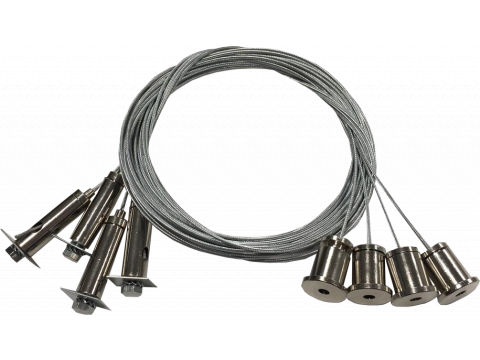 Sada na zavesenie nízkoteplotných panelov ECOSUN na strop. Sadu je možné použiť pre všetky panely, ktorých inštalačný záves má fixačný otvor v tvare kríža. Sada obsahuje štyri pozinkované oceľové lanká, káždé o dĺžke 2m a koncovky na uchytenie do stropu. Protiľahlé koncovky umožňujú skrátenie a uchytenie lanka k závesom panela.